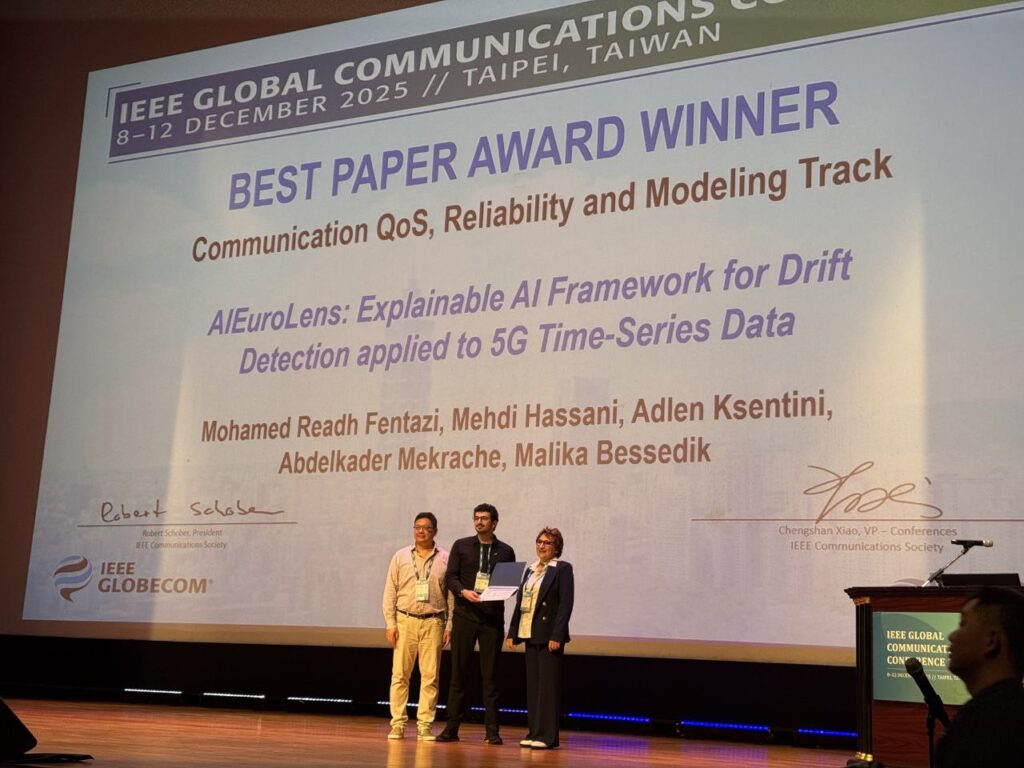 During the conference, Mohamed Readh Fentazi, representing EXACT-6G (DC06), presented the paper entitled “AIEuroLens: Explainable AI Framework for Drift Detection applied to 5G Time-Series Data.” The research addresses a critical challenge in machine learning for next-generation networks: preserving forecasting accuracy in the presence of concept drift, where data patterns evolve over time. The proposed AIEuroLens framework not only detects performance degradation but also provides explainability by identifying its underlying causes, enabling more reliable and adaptive network management.
